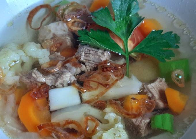 - Sop daging hangat siap dinikmati dengan petikan daun sledri dan taburan brambang goreng..