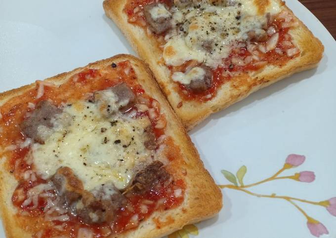 - Olesi roti dengan saus. Taburi daging. Taburi keju. Oven di 200 derajat dengan api atas selama 5 mnt hingga matang keemasan. Angkat.
